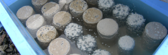 下水道施設など,バクテリアの作用によって硫酸が生成される環境下においては,設計で想定した供用期間よりも早期にコンクリート構造物が劣化している。本研究室で開発した硫酸に強いコンクリートは,主原料に鉄を製錬するときに発生するスラグを用いることで,普通のコンクリートに対して6倍の耐久性を持つものである。岡山県の水島地区でも多く発生している鉄鋼スラグの量は,全国で年間約3,800万トンで,家庭ゴミの量に匹敵している。本技術は,資源循環と構造物の長寿命化を両立させる技術として注目されている。